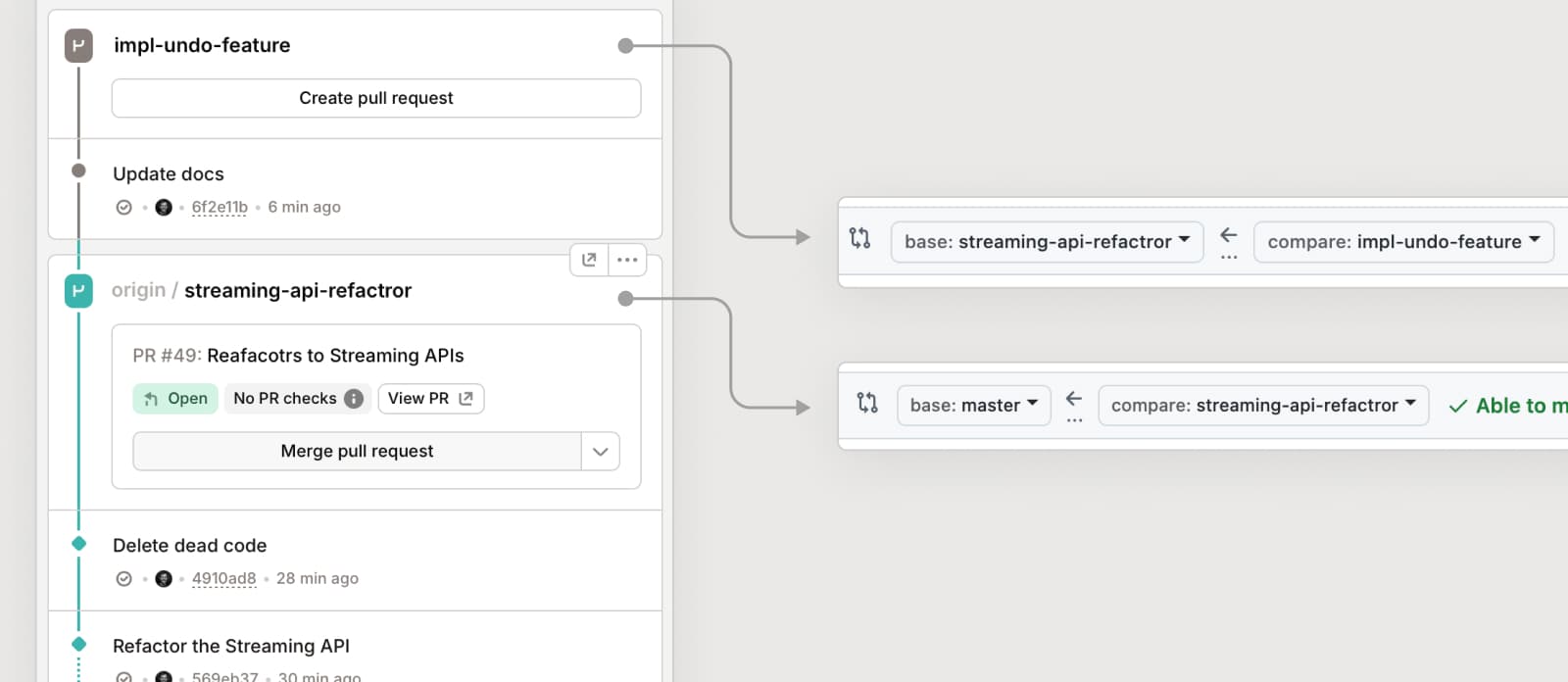 1. Review/merge your PRs starting from the bottom up. After a PR/branch from your stack has been merged, it is reflected in the Stack and you should force push to reflect the changes on the remote as well.